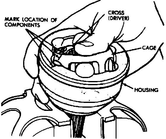 9. Clean surplus grease and mark relative position of inner cross, cage and housing with a dab of paint.