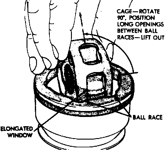 12. Tilt cage assembly vertically and position two opposing, elongated cage windows in area between ball grooves. Remove cage and inner race assembly by pulling upward from housing.