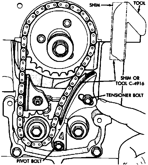 2. Place a .039 inch thick by 2.75 inch long shim or tool No. C-4916 between tensioner and chain, push tensioner and shim up against chain and apply firm pressure directly behind adjustment slot to take up all slack. Chain must have shoe radius contact as shown, Fig. 33.