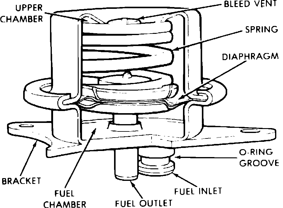 The mechanical fuel pressure regulator is used to maintain a constant pressure differential at the fuel injector tip of 14.5 psi. The pressure regulator uses a spring loaded diaphragm to control the fuel return port in order to maintain constant pressure. Pressurized fuel is delivered to the fuel injector and the pressure regulator. When fuel pressure acting on the regulator diaphragm exceeds 14.5 psi, the regulator spring is compressed and the fuel return port is opened. When fuel pressure drops below 14.5 psi, spring tension causes the diaphragm to block the fuel return port. The diaphragm and spring move constantly between the open and closed positions in order to maintain constant fuel pressure at the injector tip.