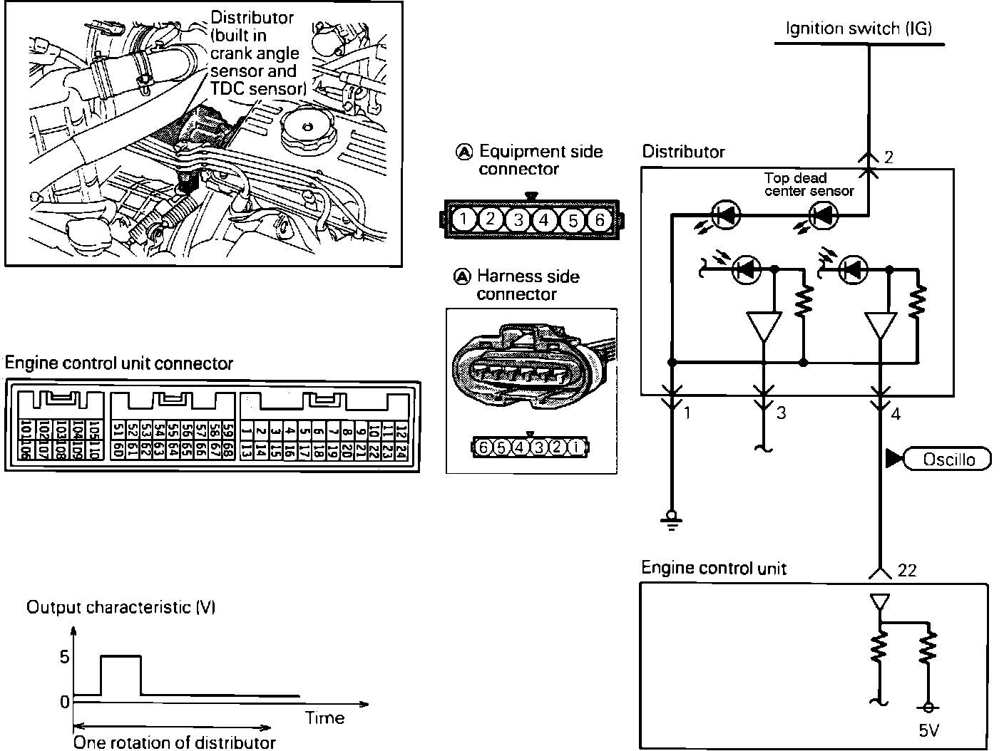 1. Connect test leads from the oscilloscope to the #4 terminal of the sensor connector and run the engine at idle speed.