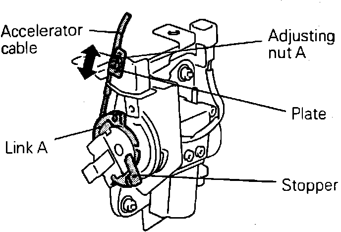 6. Move the throttle plate so that when link A is in contact with the stopper the accelerator cable has the necessary free play. Secure adjusting nut A when the proper adjustment is made.