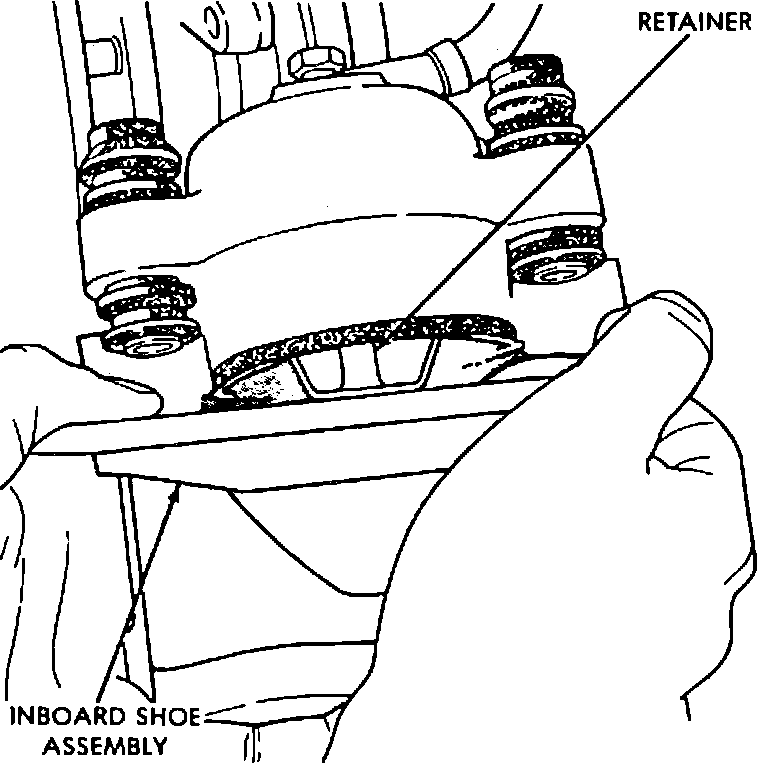 2. Install inboard pad in caliper, entering retainer into bore of piston.