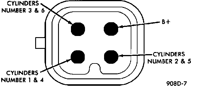 3. Measure the primary resistance of each coil. At the coil, connect an ohmmeter between the B + pin and the pin corresponding to the cylinders in question (Fig. 3). Resistance on the primary side of each coil should be 0.5 - 0.7 ohm. Replace the coil if resistance is not within tolerance.