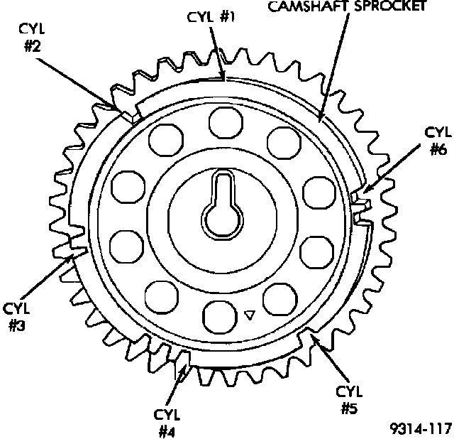 ^ When the PCM receives one camshaft pulse after the long flat spot on the sprocket, cylinder number # 2 crankshaft timing marks are next.