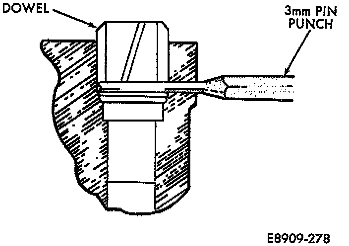 3. Install 3 mm pin punches into the holes in the block below the locating dowel bolt holes. Push the dowels in the holes until they contact the 3 mm pin punches Fig. 10.