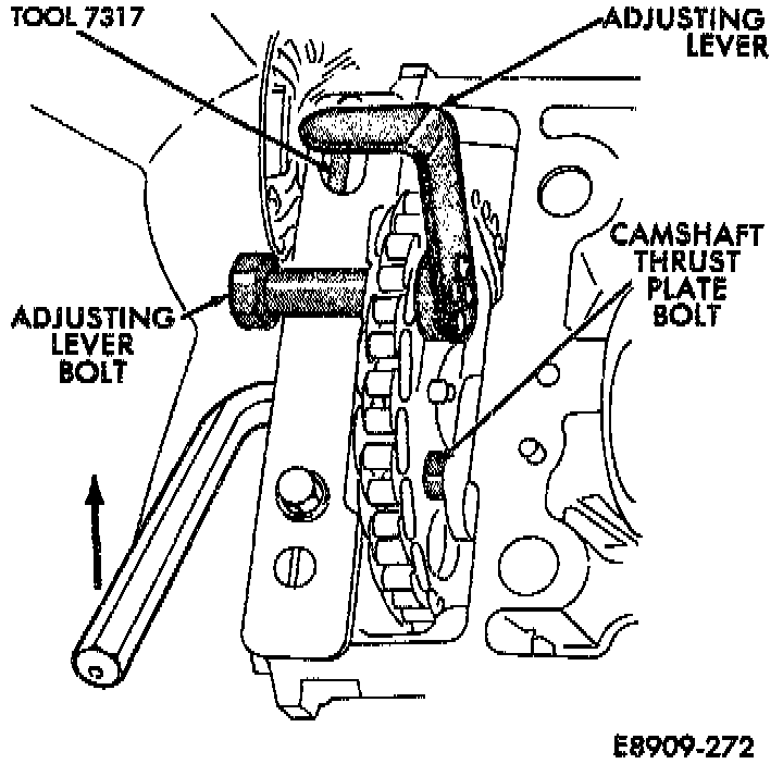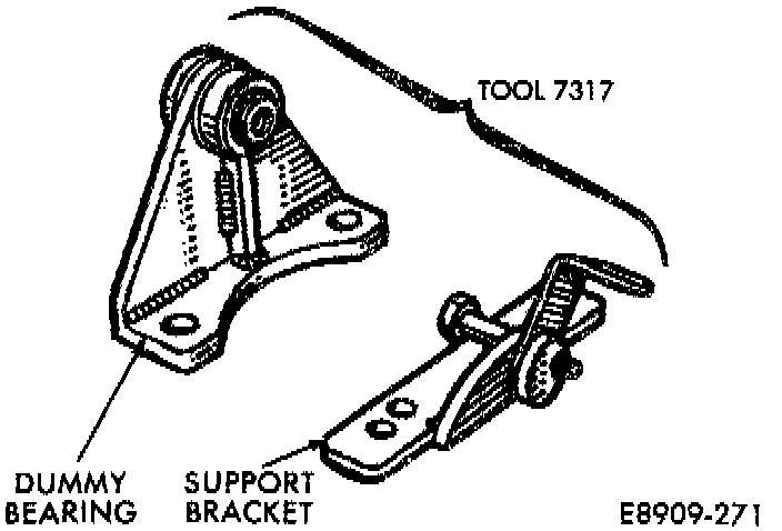 9. Use tool 7317 to support the camshaft sprocket and chain while removing the cylinder head cover. The tool consists of a support bracket and a dummy bearing Fig. 14.