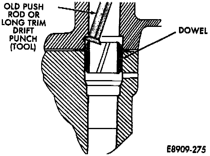 19. Use a long thin drift punch as a tool and insert it into the front and rear cylinder head bolt holes on the exhaust manifold side of the head Fig. 17. Tap the dowels down below the head gasket.