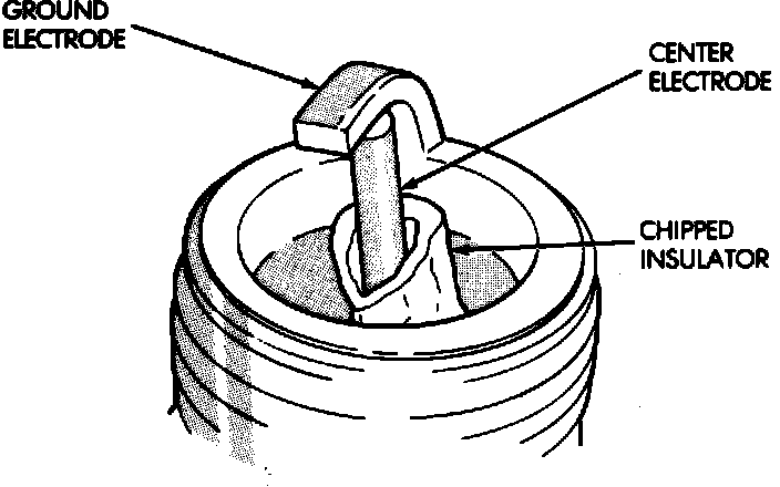 ^ A chipped electrode insulator usually results from bending the center electrode while adjusting the spark plug electrode gap.