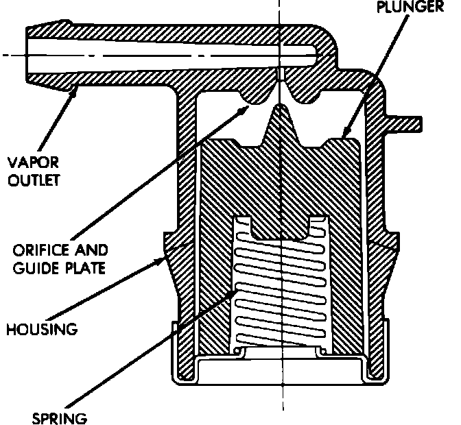 These vehicles are equipped with only one [1][2]rollover/pressure relief valve. These dual function valves relieve fuel tank pressure and prevent fuel flow through the fuel tank vent lines should the vehicle be rolled over. The valve consists of a plunger, spring, and an orifice and guide plate. The valve is normally open. In the closed position, force applied by spring pressure seats the plunger against the guide plate, shutting off the flow of fuel vapor from the fuel tank to the evaporative canister. When fuel does not reach the valve, the spring pressure is overcome and the plunger moves away from the guide plate allowing fuel vapor to flow through the valve orifice.