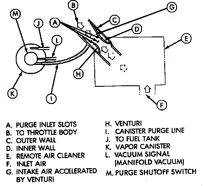 The effect of the venturi increases the speed of the intake air flowing by the purge inlet slots in the venturi wall. This creates a low pressure area at the inlet slots that draws vapors from the canister into the airstream flowing through the venturi. The vapors then pass through the intake manifold into the combustion chambers where they are consumed during combustion.