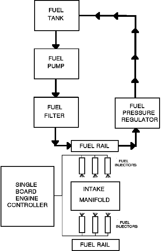 Fuel Delivery system consists of a fuel tank, fuel pump, fuel filter, fuel pressure regulator, fuel rail, six fuel injectors and associated lines.