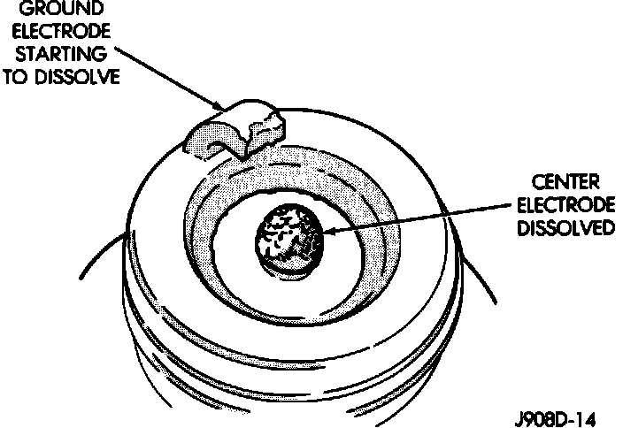 ^ Preignition damage is caused by excessive combustion chamber temperature. First, the center electrode dissolves and the ground electrode dissolves somewhat later. Insulators appear relatively deposit free.