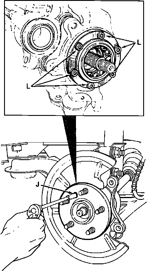 5. Remove wheel bearing to steering knuckle attaching bolts (L) through access hole (J) in front hub.