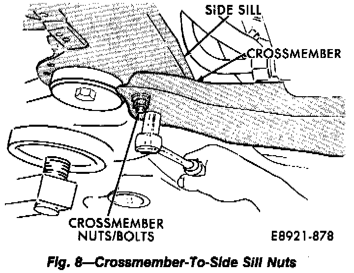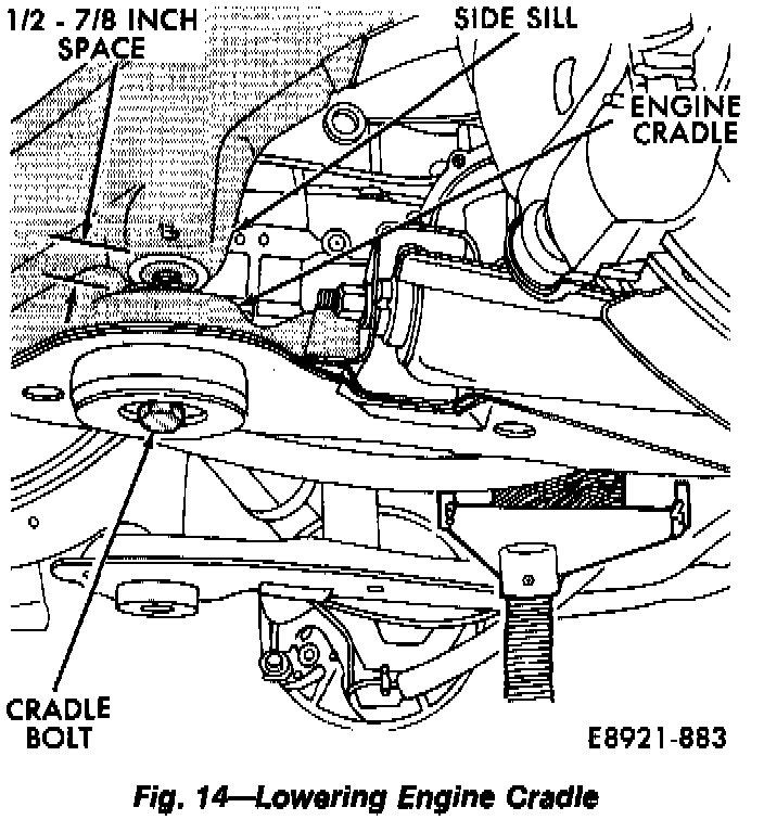 25. Lower engine cradle for working clearance. Loosen engine cradle bolts until there is 1/2 to 7/8 inch space between cradle and side sill. Do not remove bolts completely and do not lower cradle any more than specified.