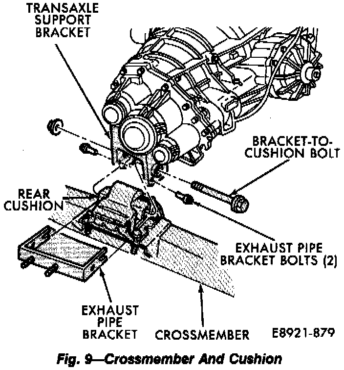 21. Install rear cushion and crossmember. Align cushion in support bracket and install cushion-to-bracket bolt and nut. Do not tighten bolt at this time.