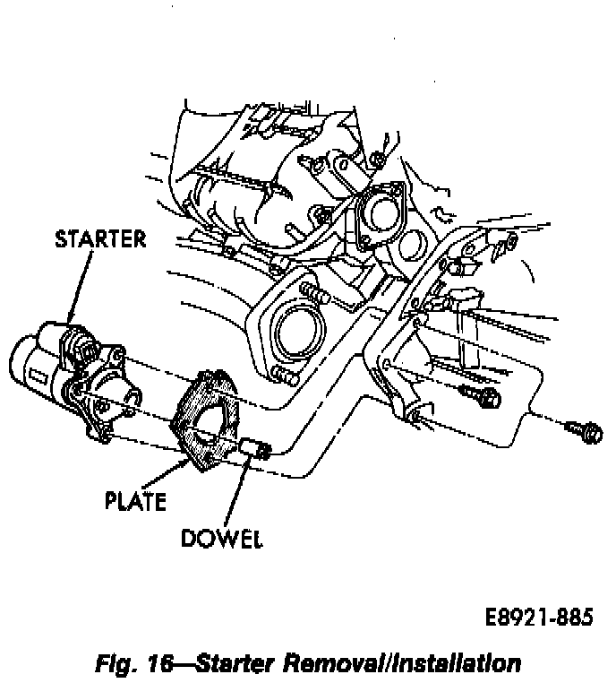 16. Install starter, starter plate and dowel. Tighten starter bolts to 42 N.m (31 ft-lbs) torque.