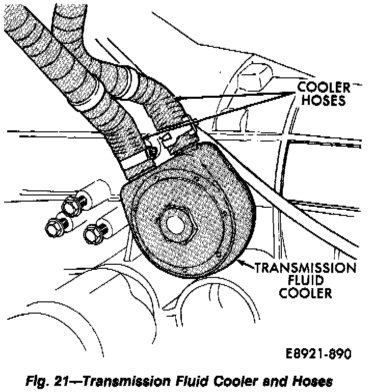 34. Disconnect transmission fluid cooler hoses. Then clamp-off, or plug hoses to prevent fluid loss.