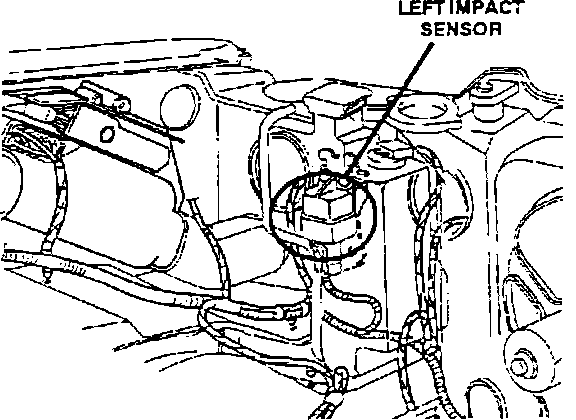 The two impact sensors are located near the left and right front corners of the vehicle, on or near the radiator closure, under the headlamp assembly.