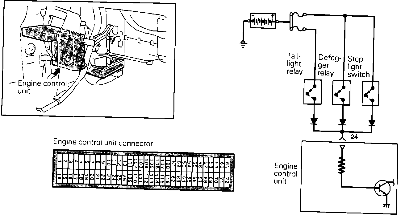 The electrical load sensing switch is incorporated within the ECU. Input signals (battery voltage) from the stop light switch, defogger relay and the tail light relay are detected by the ECU load sensing circuit. The ECU then controls the idle circuits to compensate for the extra load.