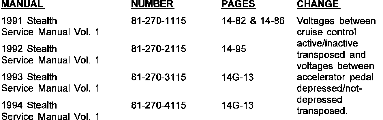 The Cruise Control System troubleshooting section in the listed manuals have pages with transposed values. The values are found in the CHECK CHART section under the troubleshooting hints chart for test 3 (1991) and test 9 (1991-1994). Please insert the corrected pages in the manuals. The corrections are highlighted with **ASTERISKS**.