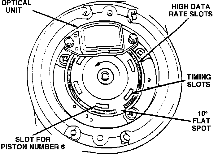 As the distributor shaft rotates the slits at the discs edge pass between the light and the optical reading part of the unit. The light emitted from the luminous diodes pass through the slits to the photo sensing diodes. When the photo diodes receive the light, they become conductive and generate a signal, which is sent to the Control Unit.