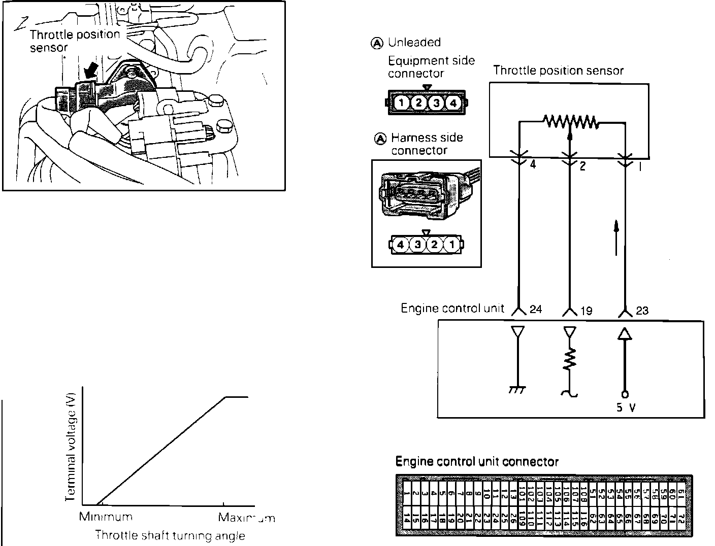 As the throttle shaft rotates, the output voltage of the TPS changes. The ECU determines the throttle valve opening based on the output voltage. The ECU computes throttle valve opening change (output voltage change) and judges the engine acceleration state and accordingly corrects fuel injection amount during acceleration.