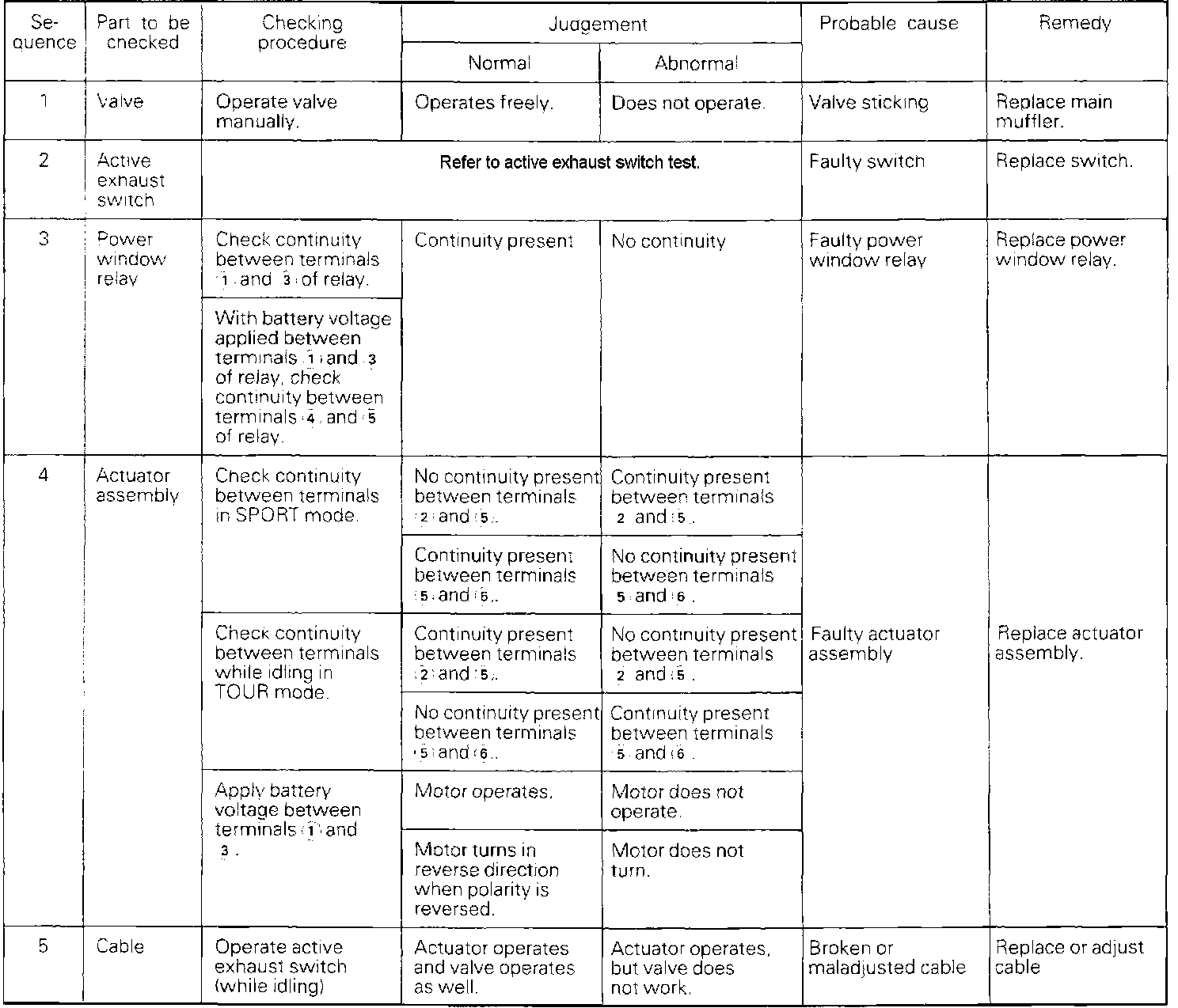 - Check the components as indicated by the diagnosis chart. If all of the individual components check OK, the problem is probably caused by a faulty Active Exhaust Control Module, and it should be checked/replaced.