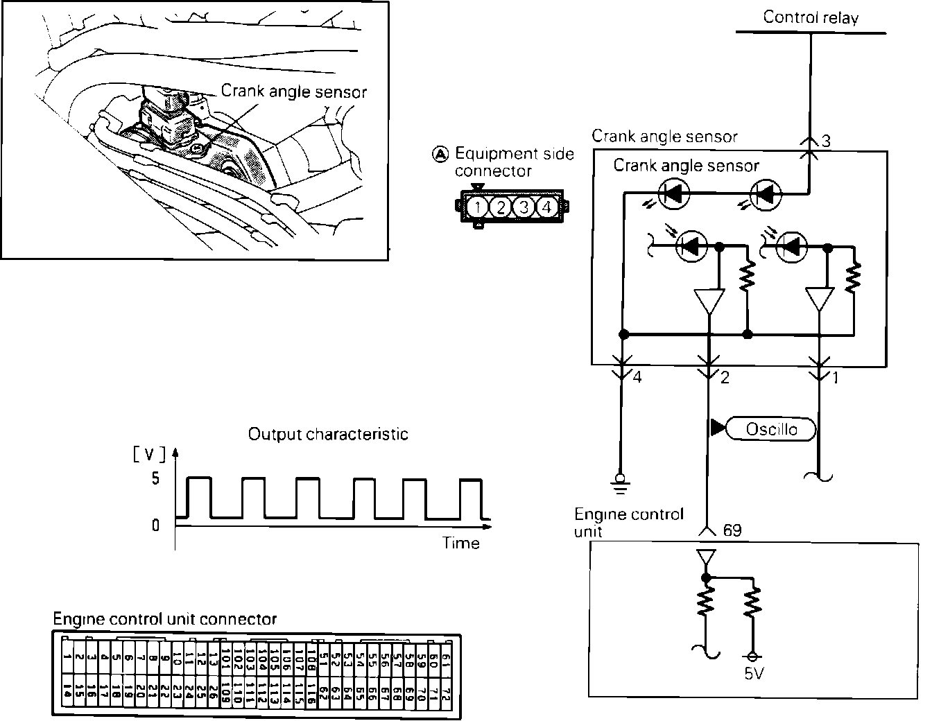 1. Connect test leads from the oscilloscope to the #2 terminal of the sensor connector and run the engine at idle speed.