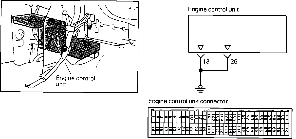 3. Using an ohm meter, check for continuity between ground and ECU harness terminals 13 and 26.