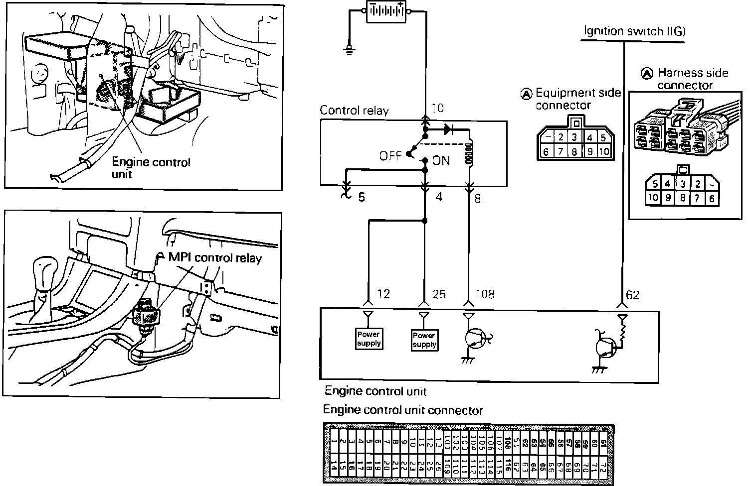 8. Using an ohm meter check for continuity between relay harness connector 4 and ECU harness connectors 25 and 12.