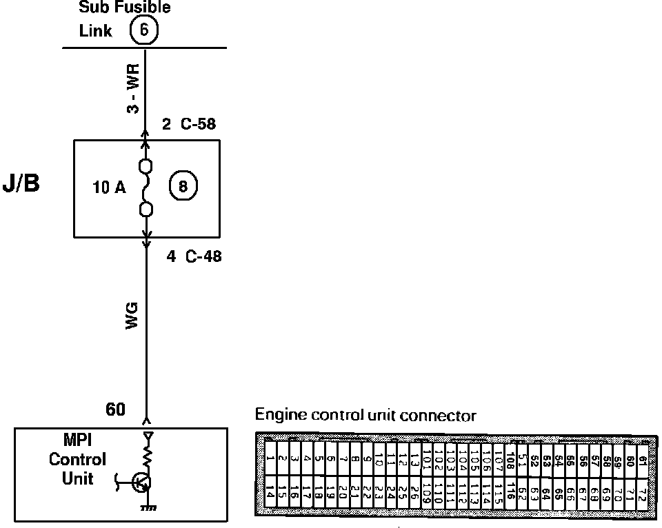 4. Using an ohm meter, check for continuity between chassis ground (not the negative battery terminal) and ECU harness terminal 60.