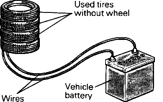 7. Connect two wires, each 20 feet or more long, to the two leads of the SRS airbag adapter tool No. MB686560, and cover connections with tape. Twist other end of wires together to prevent an unexpected deployment of air bag.