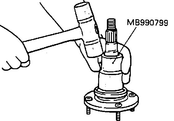 3. Position inner dust cover as shown. With oil seal installation tool No. MB990799 and plastic hammer or equivalents, gradually and evenly press fit dust cover until it contacts axle shaft shoulder.