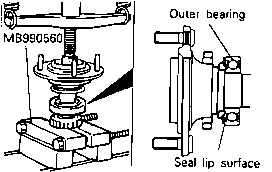 5. Apply multipurpose grease around entire circumference of inner side of outer bearing seal lip. Using bearing installation tool No. MB990560 or equivalent, press fit outer bearing to axle shaft so that the bearing lip surface is facing towards the axle shaft flange as shown.