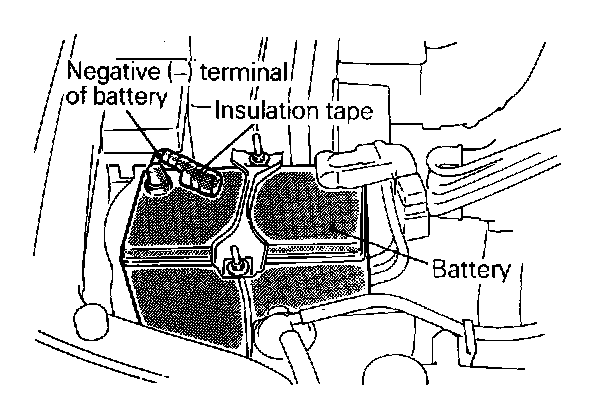 1. After the ignition switch has been placed at the LOCK position and the negative (-) terminal of the battery has been disconnected, wait for more than 60 sec6nds before starting work. Wind a tape around the disconnected (-) terminal for insulation.