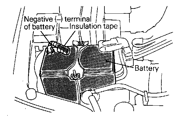 1. After the ignition switch has been placed at the LOCK position and the negative (-) terminal of the battery has been disconnected, wait for more than 60 seconds before starting work. Wind a tape around the disconnected (-) terminal for insulation.