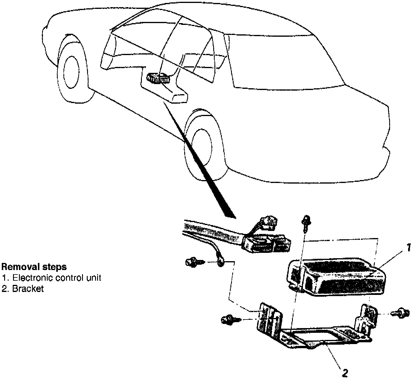 Replace the ABS ECU in numbered sequence shown, by removing the unit from the bottom of the center console.