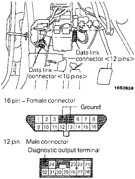 Caution: In connecting the voltmeter to the ground terminal (terminal 4 or 5), use the special tool [MB991529 (diagnostic trouble code check harness)].