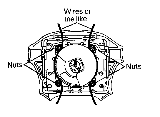 4. Install a disused nut to each of the four bolts on the rear side of air bag module and connect thick wires to these bolts to secure the module to the wheel.
