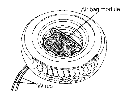 6. Put the air bag module in the wheel fitted with a used tire. Using the wires or the like connected to the module's bolts, secure the air bag module. Then turn the module upward.