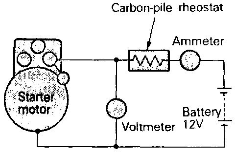 a. Connect a test ammeter (100-ampere scale) and carbon pile rheostat in series with battery positive post and starter motor terminal.