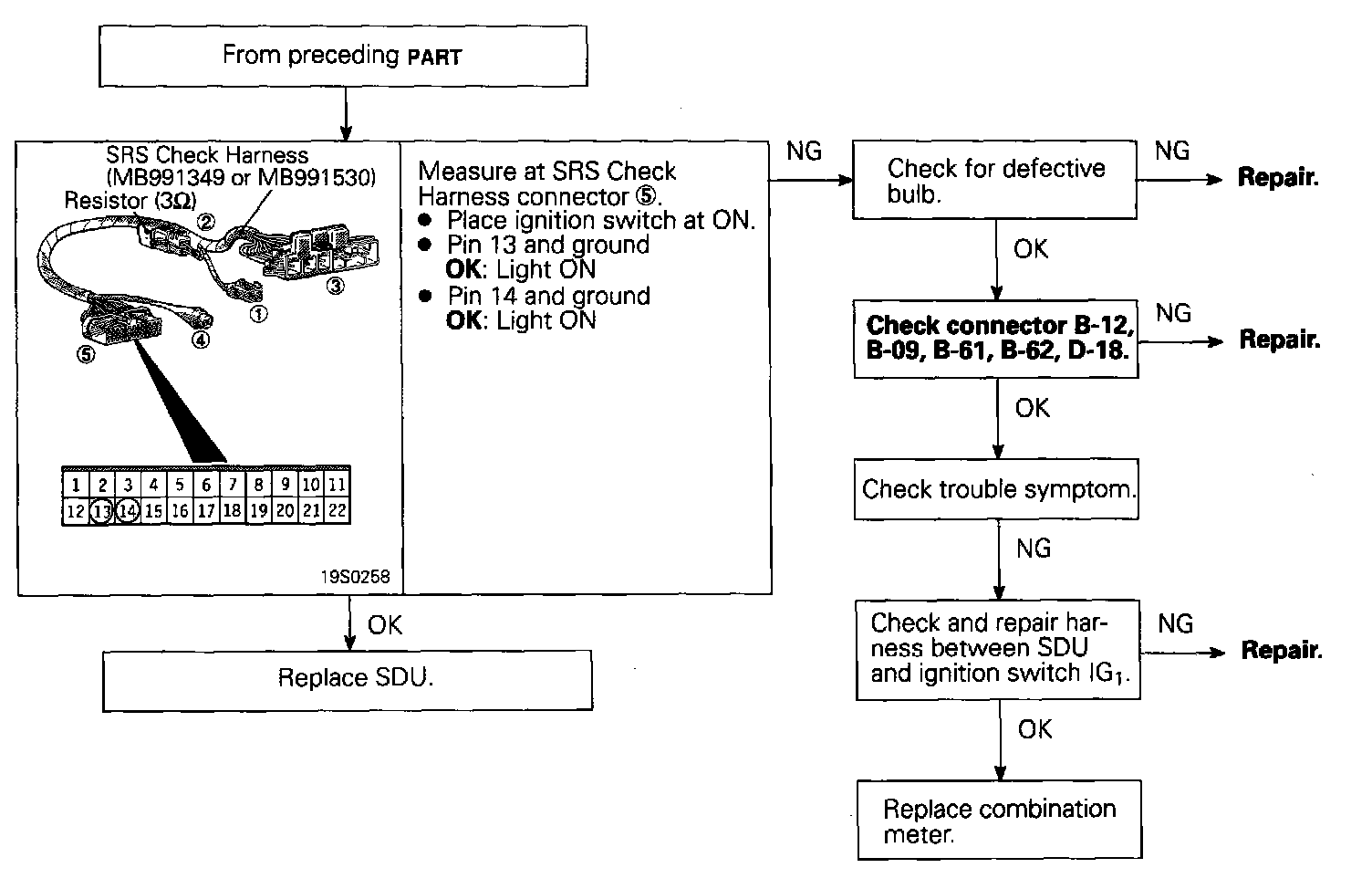 The SDU monitors the SRS warning light circuit and outputs this code when the circuit has been open for five seconds because of a break in the light or the harness, loose connection, etc. When the normal state is restored for a continuous period of 5±0.2 seconds, code No.43 is automatically erased, and the SRS warning light goes out.
