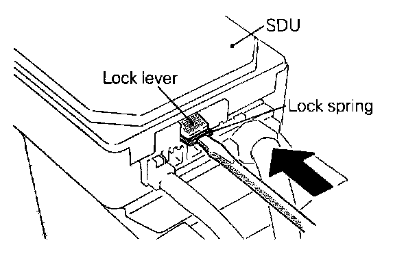 2. To unlock the SDU connector, put a flat tip screwdriver on the lock spring (metallic portion) of the lock lever as shown, and press it horizontally toward the inside of the unit. In this case, do not force the lock lever up. Do not put the flat tip screwdriver in the clearance between the lock lever and lock spring (metallic portion).
