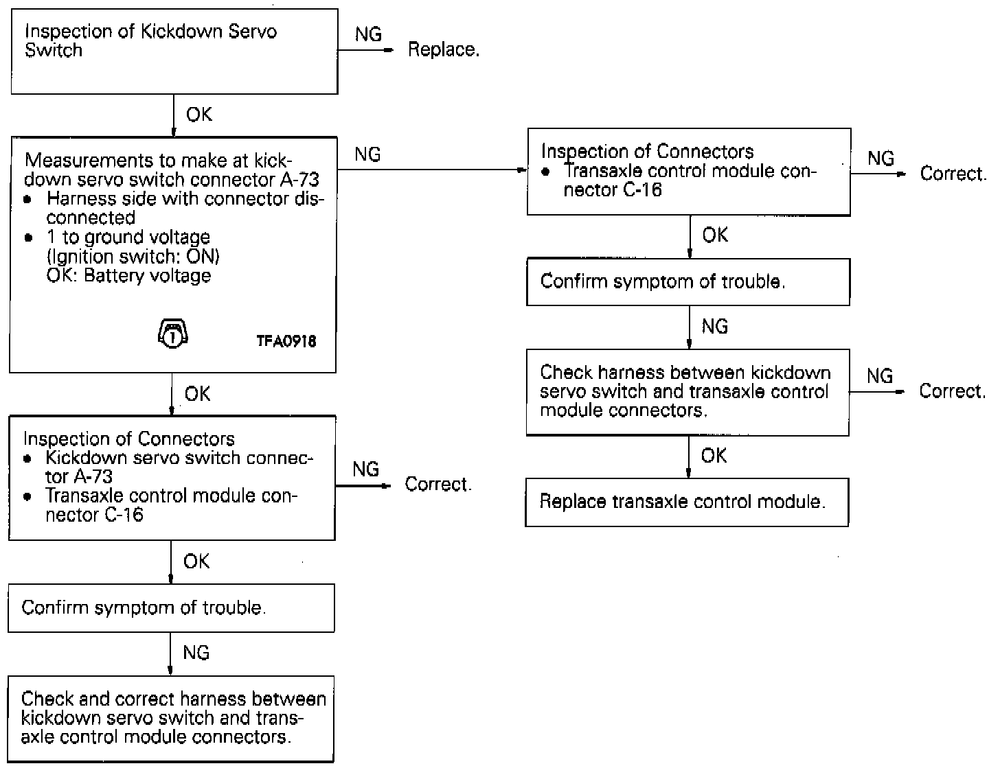 If the kickdown servo switch is OFF in 1st and 3rd speeds, code No. 21 is output to indicate that the kickdown servo switch is open-circuited. If the kickdown servo switch is ON in 2nd and 4th speeds, code No. 22 is output to indicate that the kickdown servo switch is short-circuited.