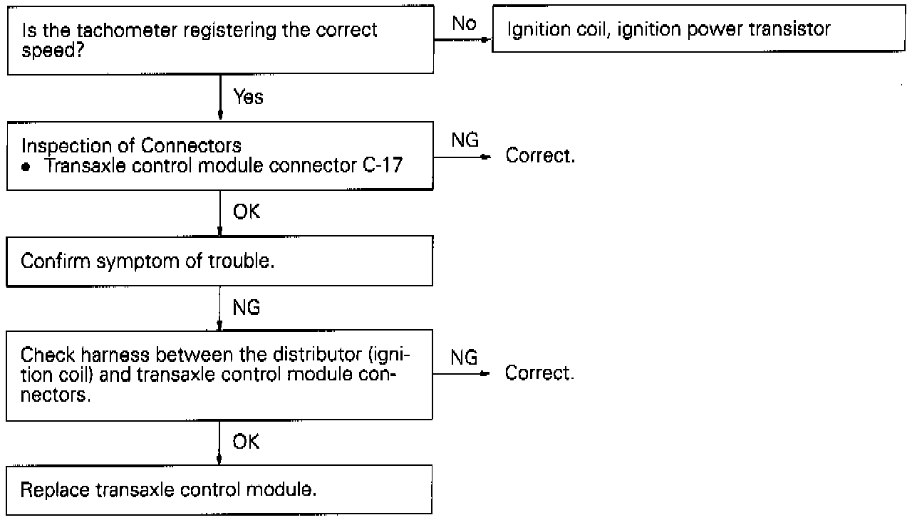 If no ignition pulse is input to the transaxle control module while the engine is running, code No. 23 is output to indicate that the ignition signal line is open-circuited.