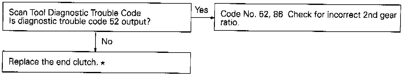 After a shift to the 4th speed has been completed, if the value of the PG-A output (input shaft speed) divided by the 4th gear ratio does not coincide with the PG-B output (output shaft speed), code No. 54 is output. If associated diagnostic trouble code (No. 51, 52, 53, 54) is output four times, fail safe code No. 86 is output to indicate that the 4th gear ratio is incorrect and this activates the fail safe function to lock transaxle at the 3rd speed (D) or 2nd speed (2, L).