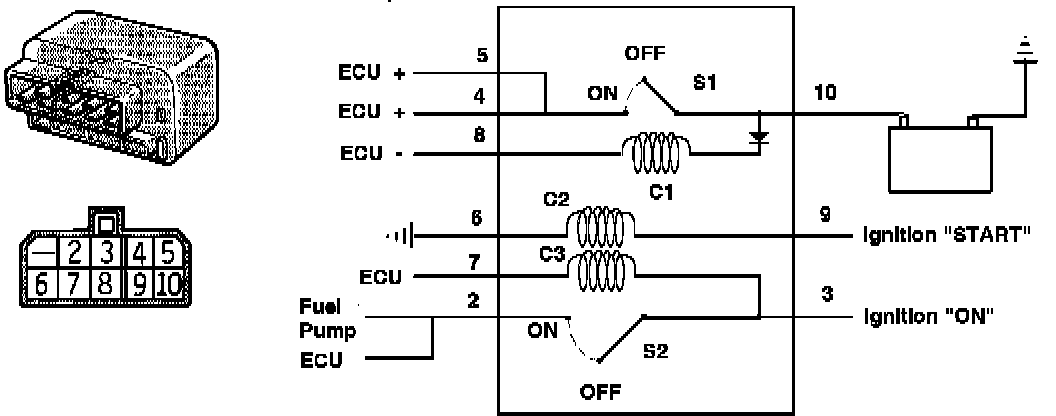 When the key is in the START position, current flows from the ignition switch through the control relay coil C2 to ground. This turns on control relay switch S2, supplying battery voltage to the fuel pump. Once the engine starts and the key is in the ON position, the ECU supplies the ground circuit to the control relay coil C3, keeping control relay switch S2 closed, energizing the fuel pump.