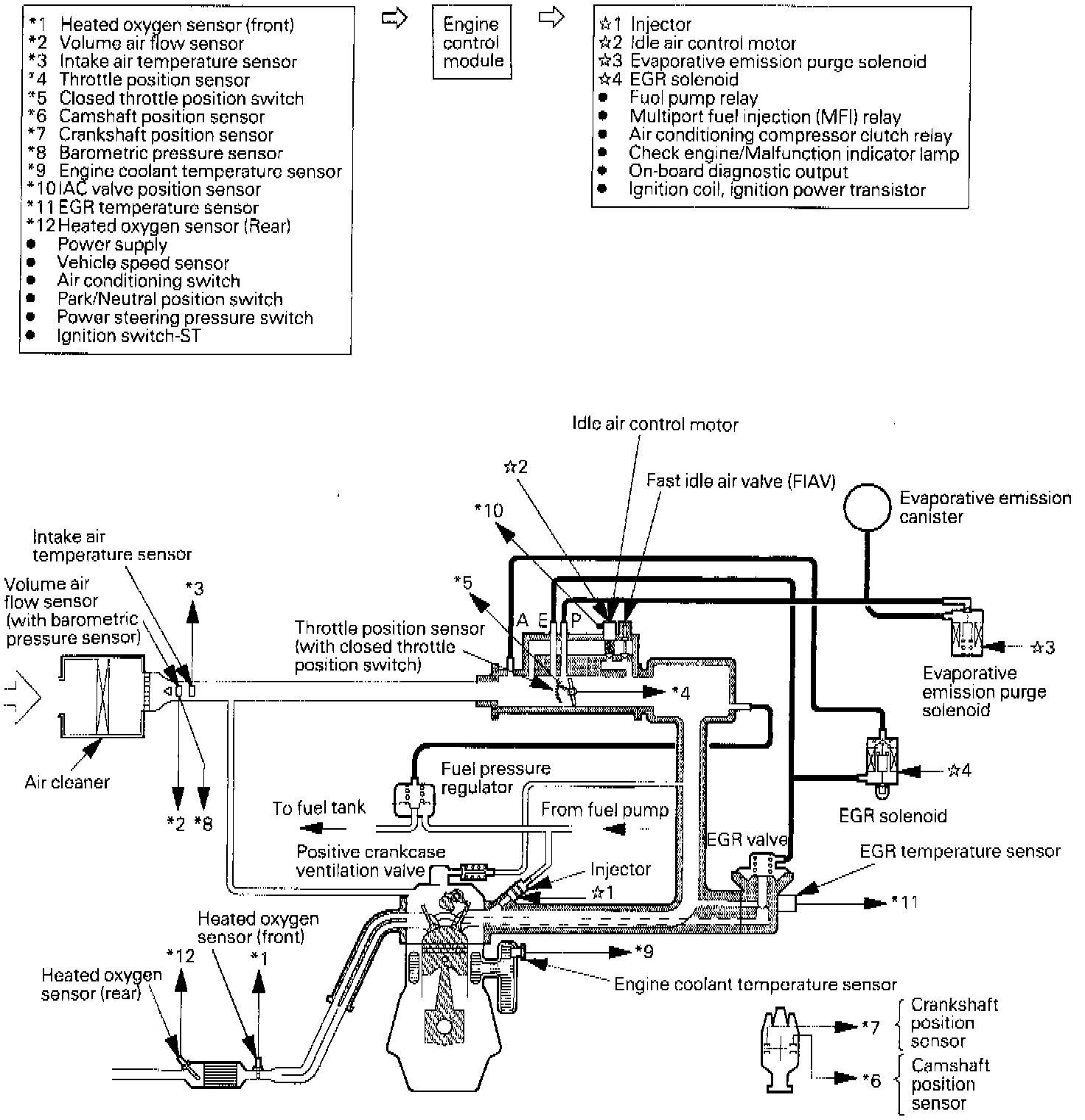 The multiport fuel injection (MFI) system consists of the sensors which detect the engine condition, the engine control module (ECM) which controls the engine on the basis of the sensor signals, and the actuators which operate under control of the ECM. The ECM controls the fuel injection, idle speed, ignition timing, etc. In addition, the ECM is provided with some diagnostic test modes (DTM) to facilitate troubleshooting in case of failure.