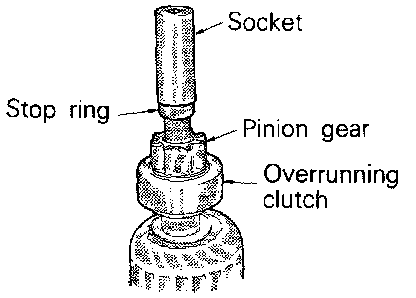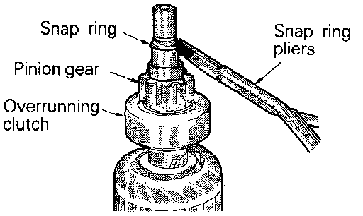 2. Remove snap ring with snap ring pliers and then remove stop ring and overrunning clutch.